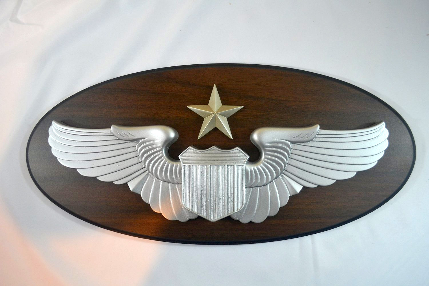 17.5″ X 8″ walnut grain plaque with mounted service badge